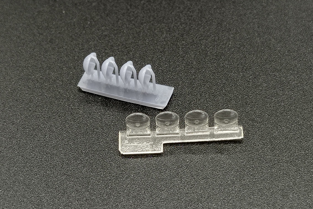 Las piezas están impresas en resina gris para el cuerpo del faro y transparente para su cristal.