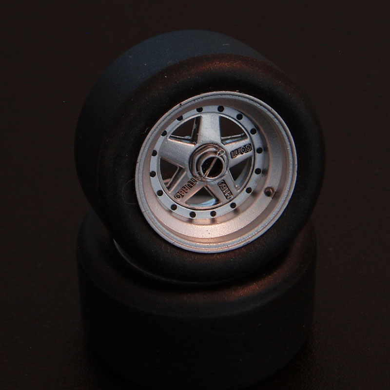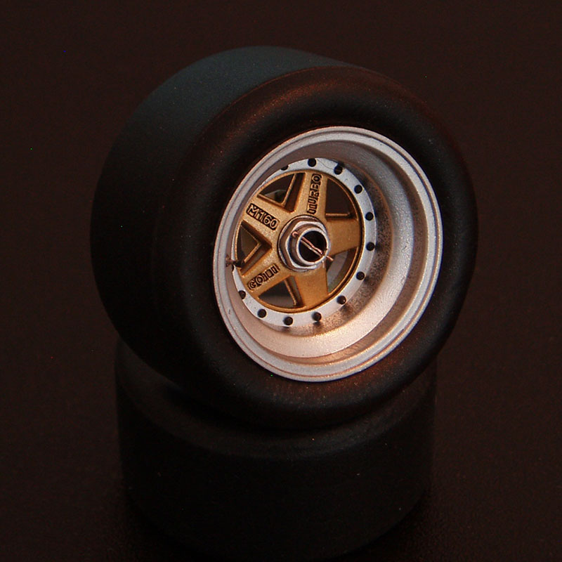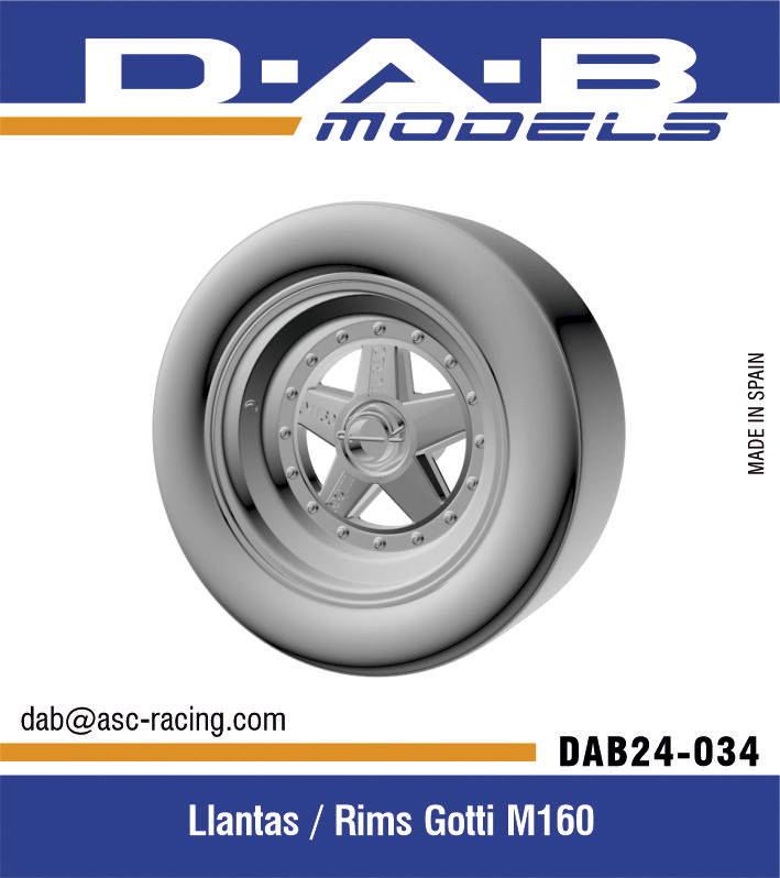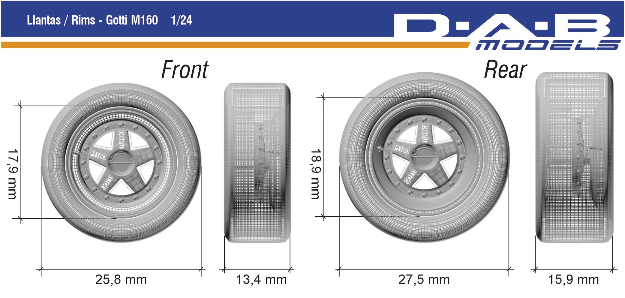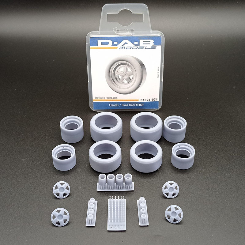 Núcleo de la llanta separado para facilitar su pintura, válvulas y tornillería aparte, neumáticos en resina, dos opciones de tuerca central con y sin horquilla de bloqueo y acoples para poderlas adaptar a la mayoría de fabricantes de maquetas.