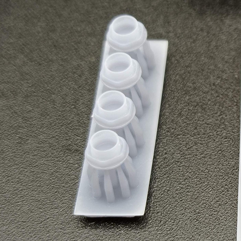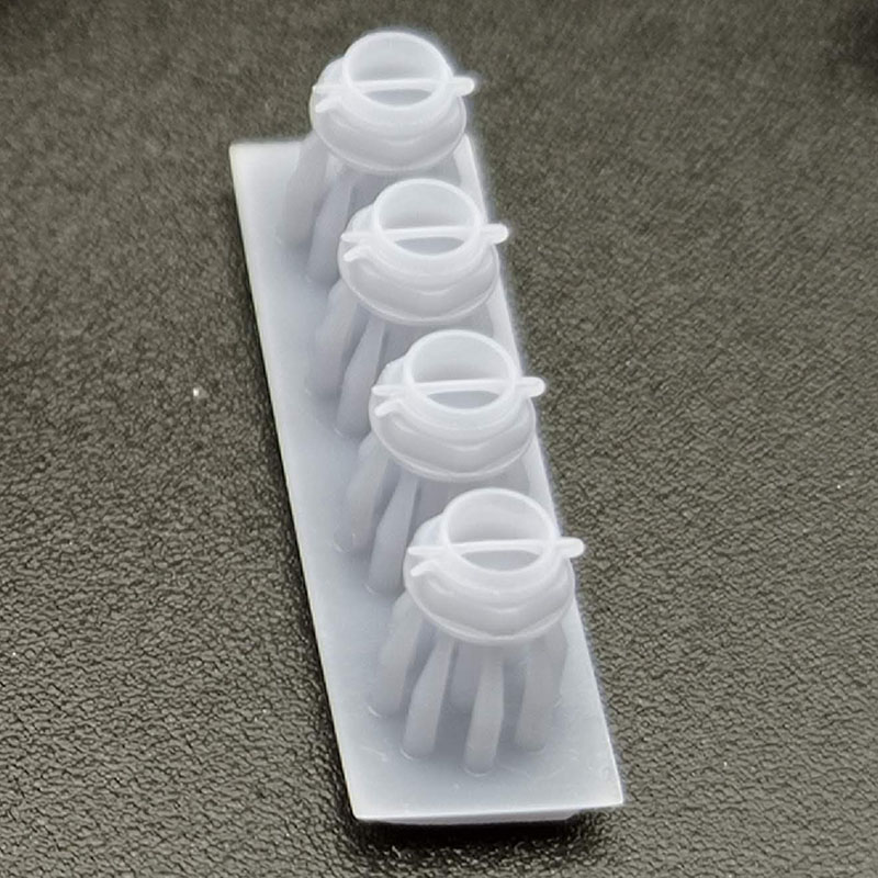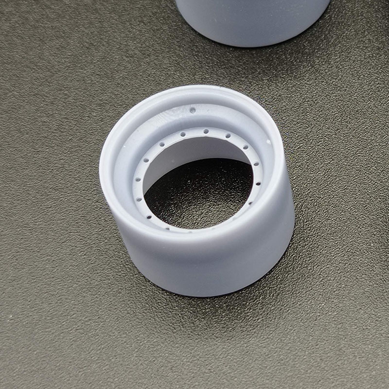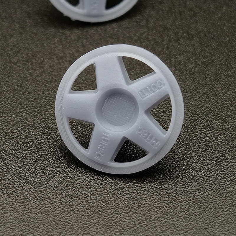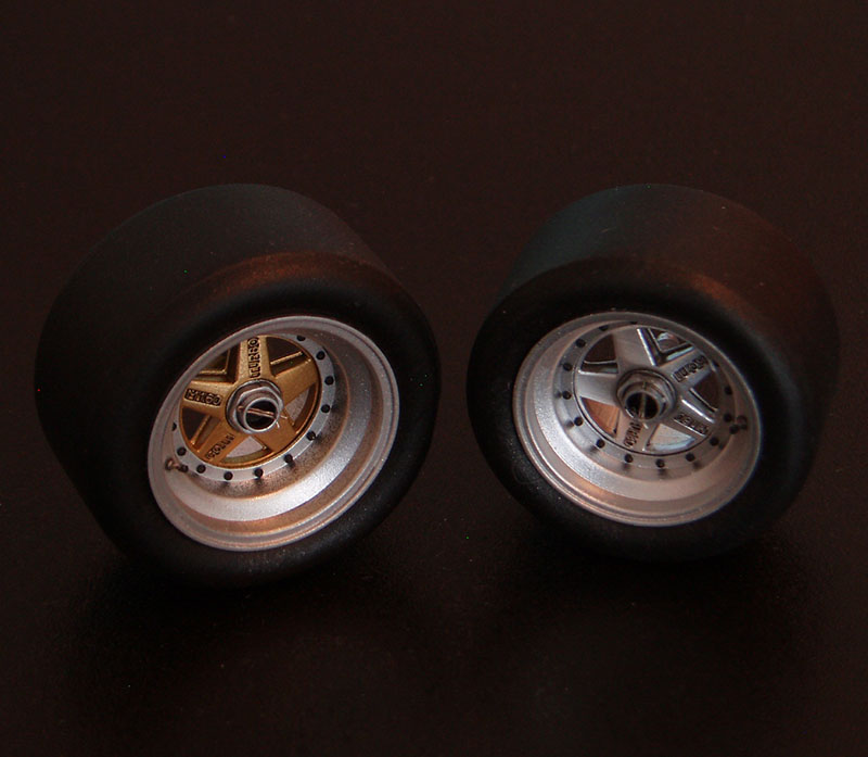 Núcleo de la llanta separado para facilitar su pintura, válvulas y tornillería aparte, neumáticos en resina, dos opciones de tuerca central con y sin horquilla de bloqueo y acoples para poderlas adaptar a la mayoría de fabricantes de maquetas.