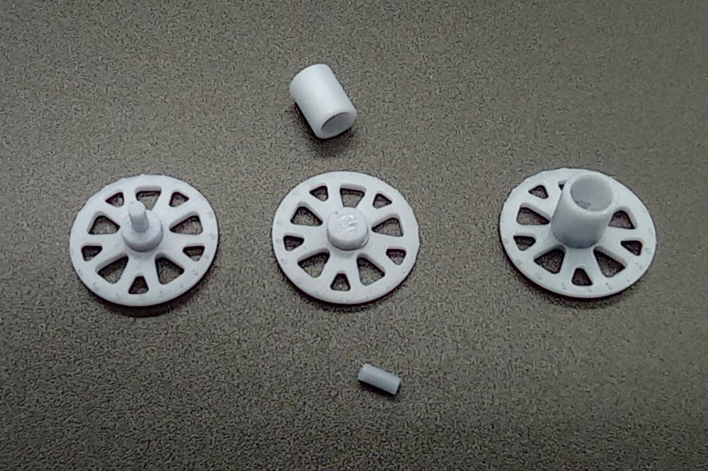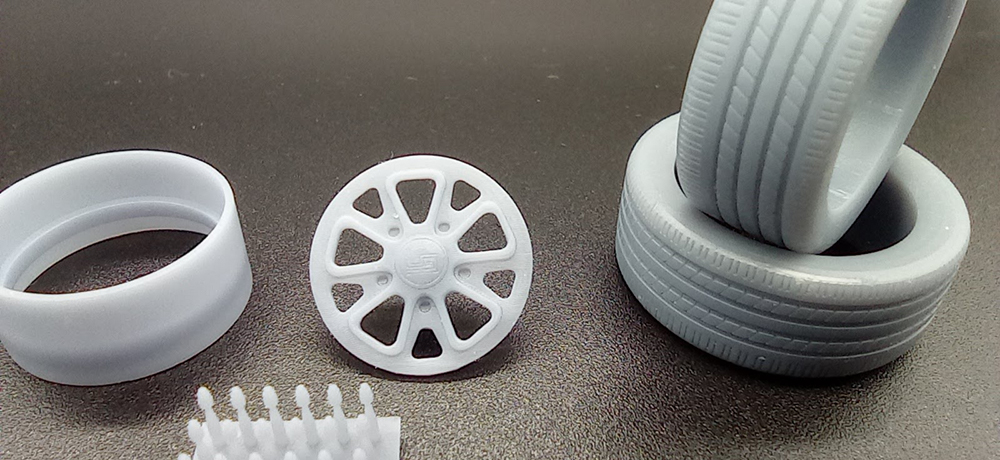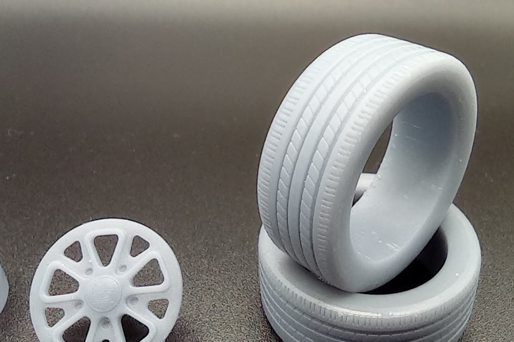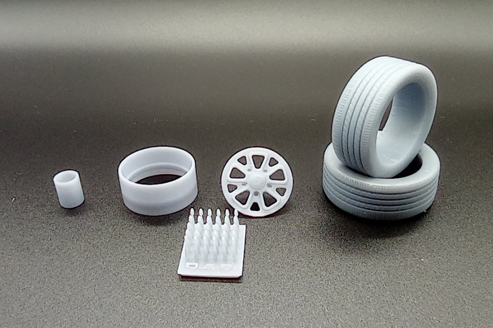 El juego lo componen en llanta, sus radios, el neumático, tornillería y válvula de inflado más un adaptador para fijarla en las marcas más comunes de maquetas.